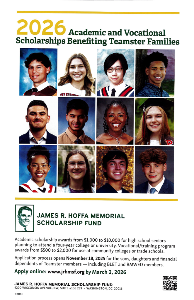 The scholarship is open to seniors of the Class of 2026 who are the financial dependent of a Teamsters member in good standing. Scholarships will be available for use towards a four-year college or university as well as vocational/training programs that are related to work in a Teamsters represented industry (such industries include but are not limited to nursing, bioengineering, aviation, film arts, and welding).