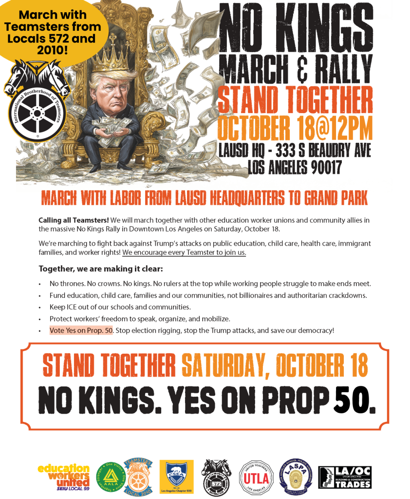 Calling all Teamsters! It’s time to make a showing! JOIN US as Local 572 rallies with our LAUSD members in a show of solidarity with ALL LAUSD UNIONS. We will meet in front of LAUSD HQ and march to Grand Park for the main #NoKings rally. See you there!